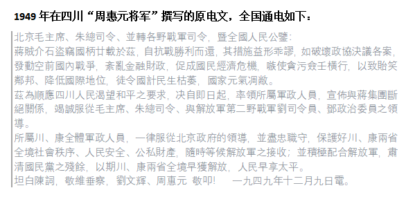 [1949年周惠元将军撰写的 全国通电原文]